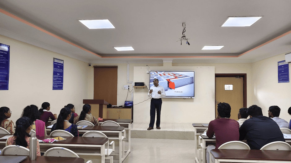The Department of Management Studies organised a Guest Lecture on 13th August 2025, titled “Building Financial Security Through Insurance Awareness” for MBA Second Year Students. Ramesh Kumarasamy, Sr Regional Head – Bajaj Allianz Insurance was the resource person. He shared Key insights about Leadership, Insurance Awareness..