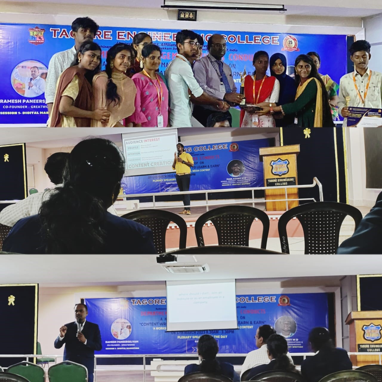 The department of Management studies successfully conducted a national level marketing workshop on “Content writing for social media: A way to learn to earn”- A workshop to earn money through your social media content’. The event was conducted on 17th March, 2023 at the college Auditorium. The students from various colleges participated in the event. The plenary speakers of the day were Mr. M. D. PAUL KENNY – General Manager, Innovations &Administration, BEHINDWOODS and Mr. RAMESH PANEERSELVAM – Co-Founder, Greatworks. Two sessions were planned for the day, apart from this two events – Marketing Lingo and AD- Selfie were planned.
