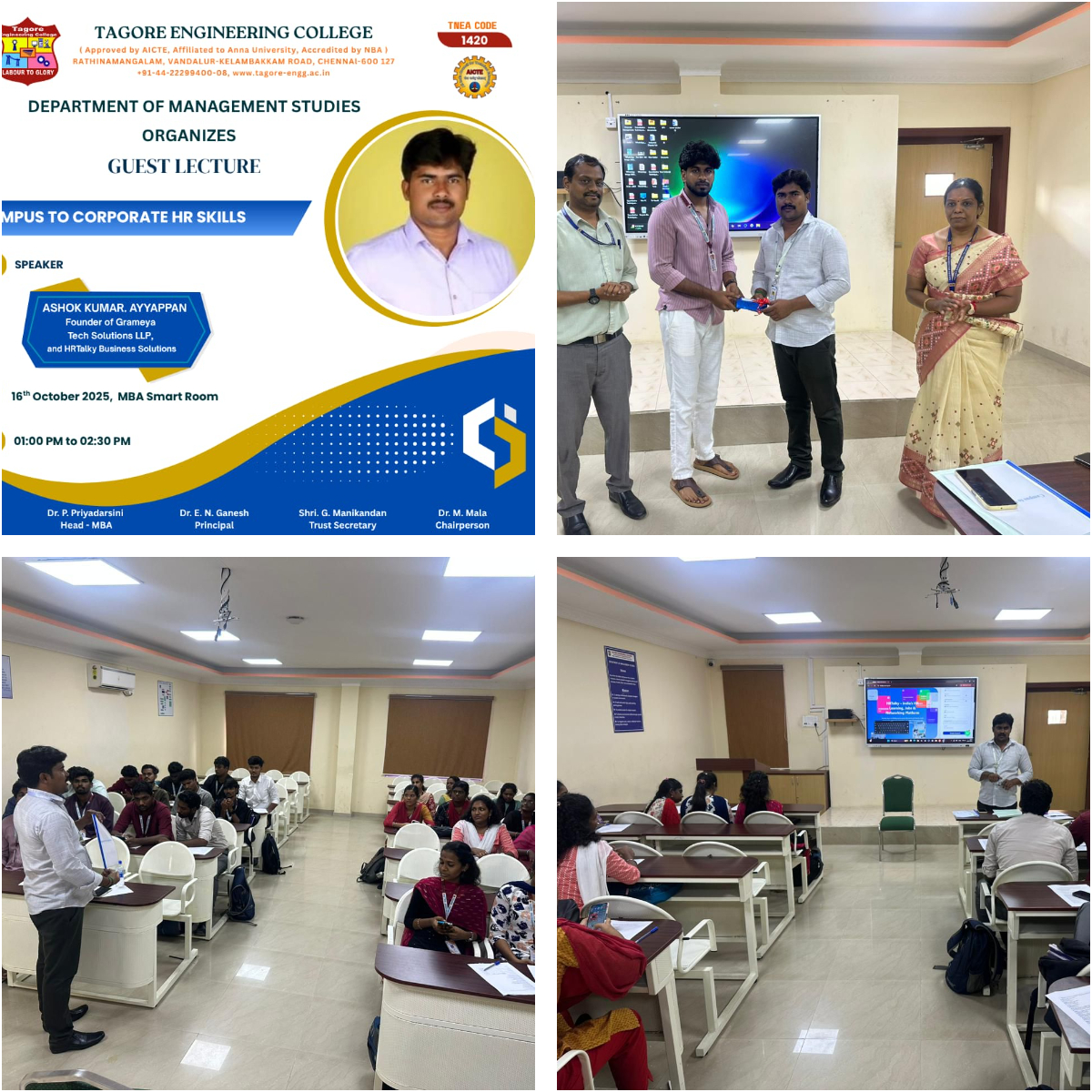 The Department of Management Studies organised a Guest Lecture on 16th October 2025, titled “Campus to Corporate HR SKILLS ” for MBA Second Year Students. Ashaok Kumar.A Founder of Grameya Tech was the resource person. He shared Key insights about recent trends and skill set required in the field of Human Resource.