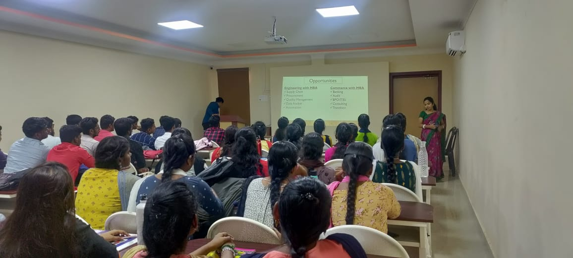 The Department of Management Studies succeefully conducted one week Induction programme from10th of October to 15th of October, to MBA freshers. The one-Week Induction was filled by the guest speakers, resource persons from Industry experst and Acadamecians. The students were briefed on their journey with MBA course, the gap between the industries and fresh graduates. The expectations of Industries from MBA graduates, job opportunities, soft skill training session, Alumini talk were arranged, so that these sessions are eye openner and informative for the students. Through these session students learn the importance of MBA course and set theie goals before starting their journey.