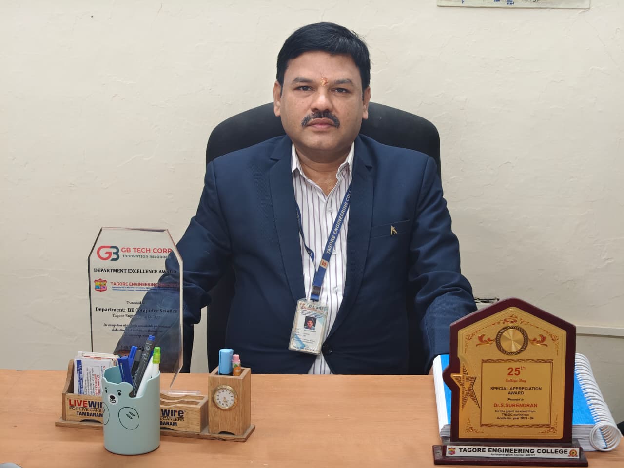 Dr. S.SURENDRAN, M.E(CSE), Ph.D(CSE) is an academician with 25 years of experience and currently working as Professor and Head in the Department of Computer Science and Engineering at Tagore Engineering College. He received his doctorate in 2015 from Anna University, Chennai. He has been with Tagore Engineering College since 2008. He has more than 14 years of research experience in Mobile Adhoc Network, Machine Learning and Software Engineering with a specific focus on Design thinking and critical problem-solving.