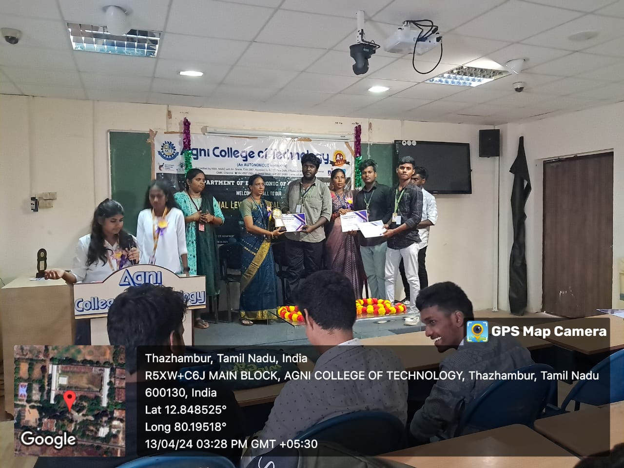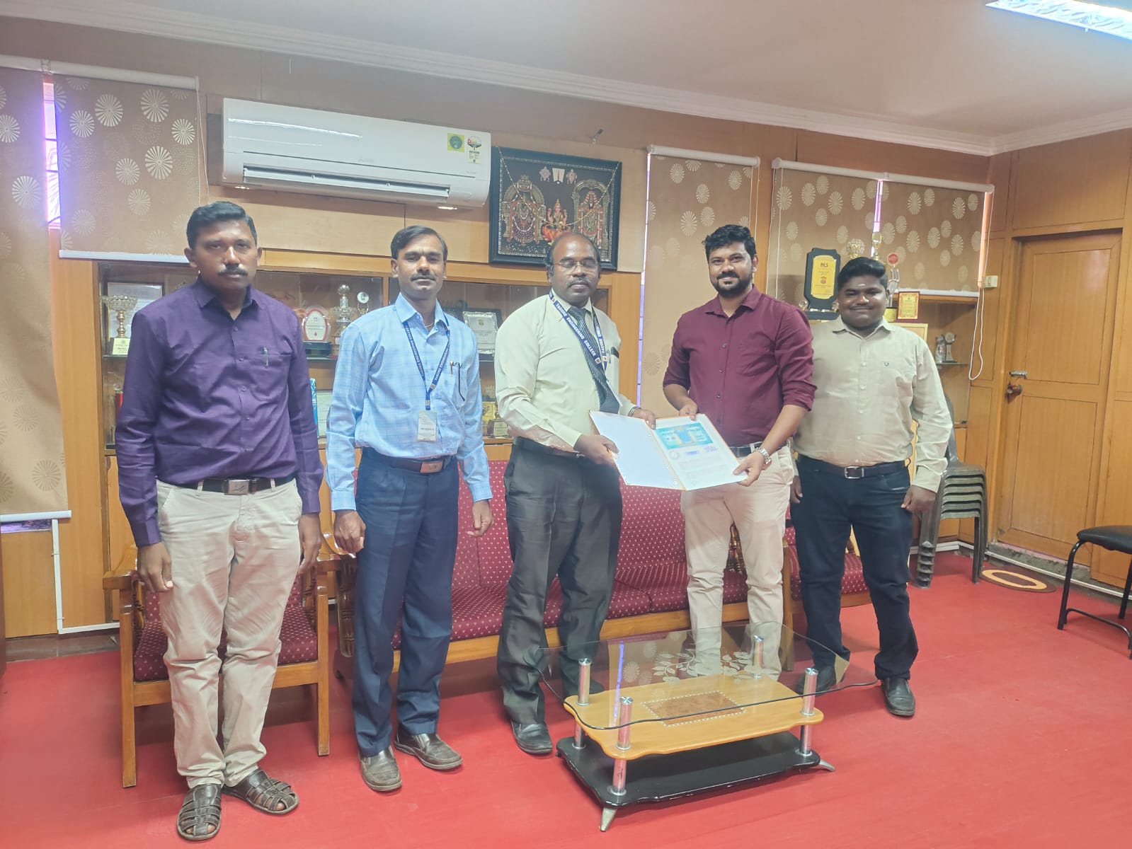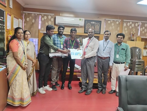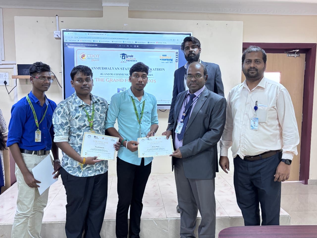 Final year ECE students Mr.Arunachalam S, Mr.Mathiyazhagan S, and Mr. Rupesh R have secured 1st Prize in the prestigious "INDUSTRIAL IoT & INDUSTRY 4.0 HACKATHON - 2024", organized by "INGAGE TECHNOLOGIES" under the Naan Mudhalvan Scheme -TNSDC, Tamil Nadu. (Against 180 teams and 500+ participants).