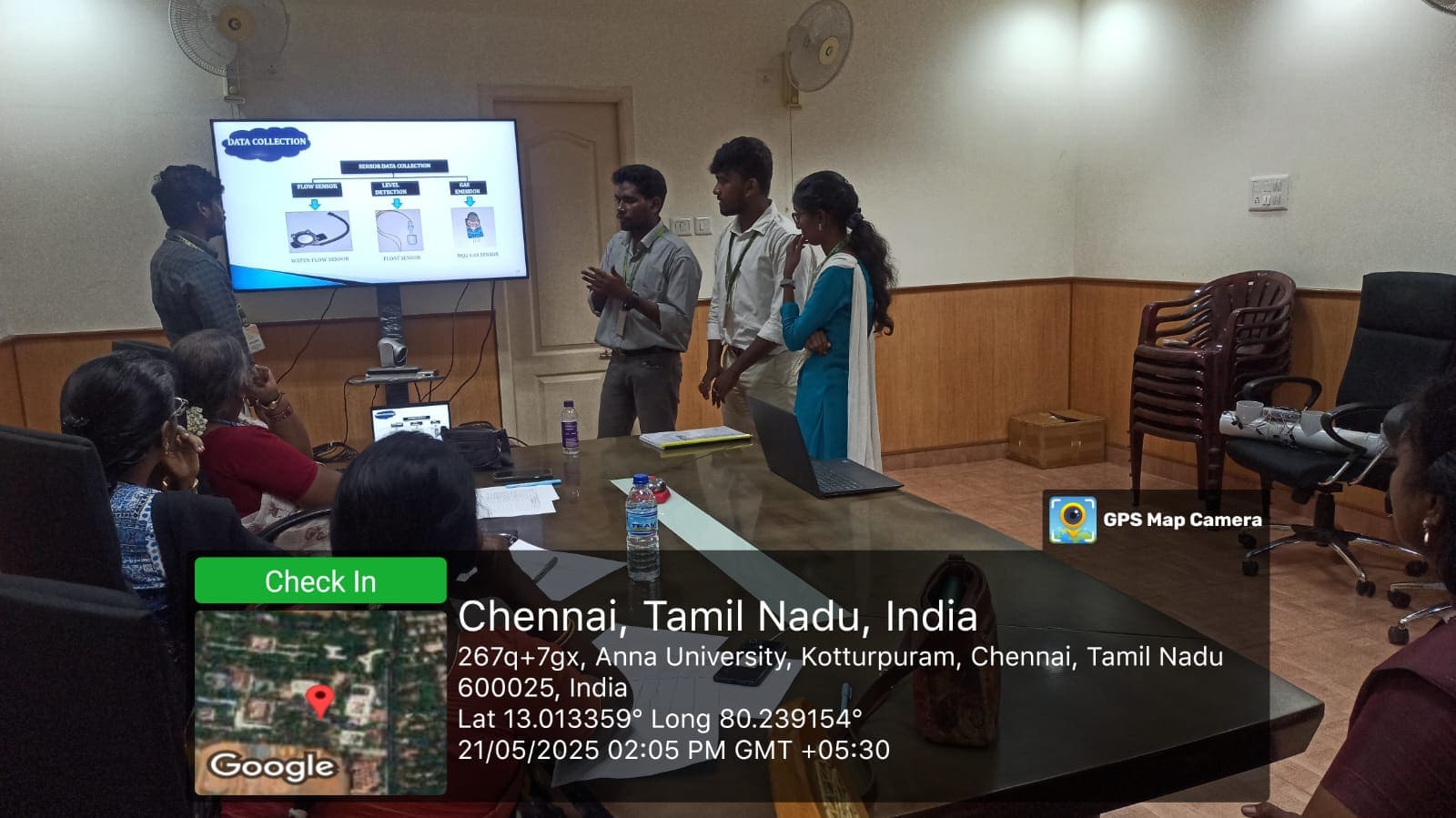 ECE Final year students Bharathi G, Kalpana S, Udhaya kumar A and Vignesh M under the valuable guidance of Faculty Mentor Dr. R. Porselvi participated Naan Mudhalvan, “Niral Thiruvizha 2.0 (Hackathon)” final review Titled “IoT – Powered Automatic Sewage Monitoring and Alerting System” at Anna University, CEG campus on 21.05.2025