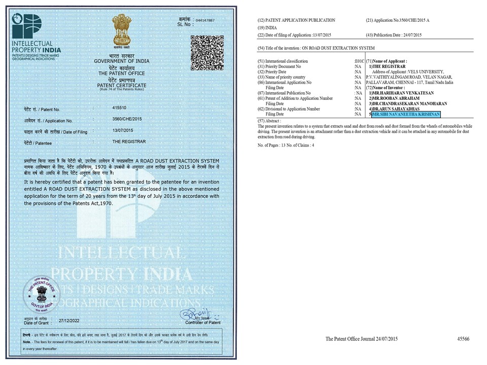 Patent Awarded to Mr. N. Sibi for ‘A Road Dust Extraction System’ on 27.12.2022
