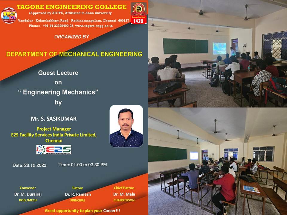 Guest Lecture on Engineering Mechanics by Mr. S. Sasikumar, Project Manager, E2S Facility Services India Private Limited on 28.12.2023
