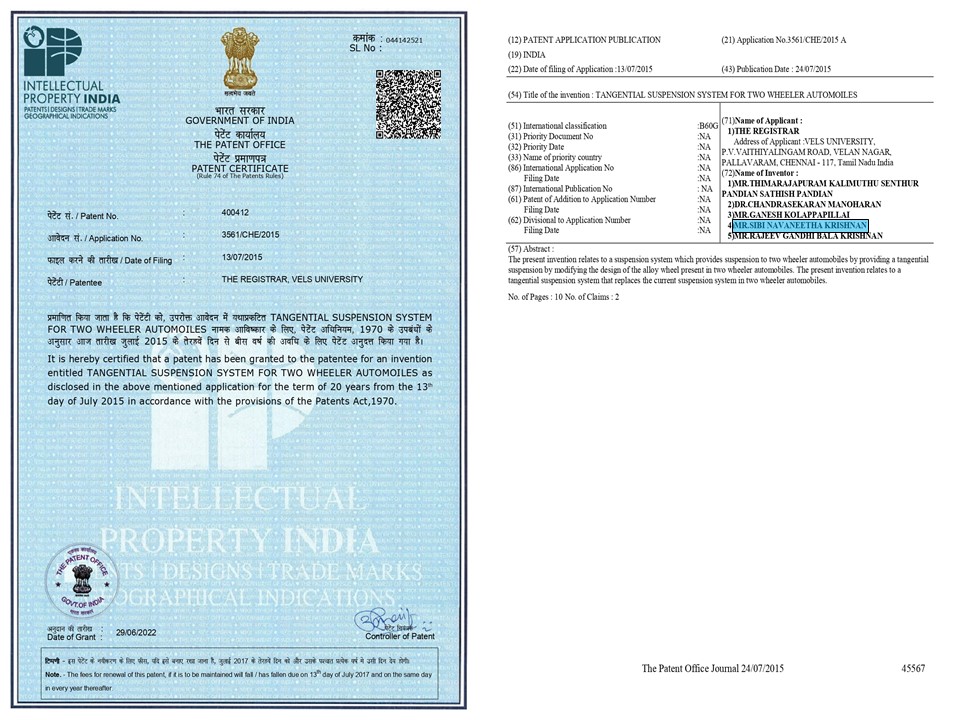 Patent Awarded to Mr. N. Sibi for ‘Air O Spring Suspension System’ on 15.11.2022