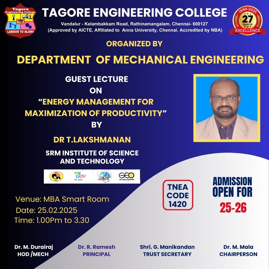 A Guest Lecture on “Energy Management for Maximization of Productivity” by Dr.T.Lakshmanan, Professor , SRMIST with sponsorship of GAIL India Ltd on 25th Feb 2025.